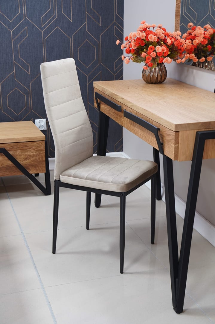 Čalouněná moderní jídelní židle Fado. Kovové nohy, prošívaný potah. Židle Fado určené pro milovníky pohodlného posezení nejen u jídelního stolu.