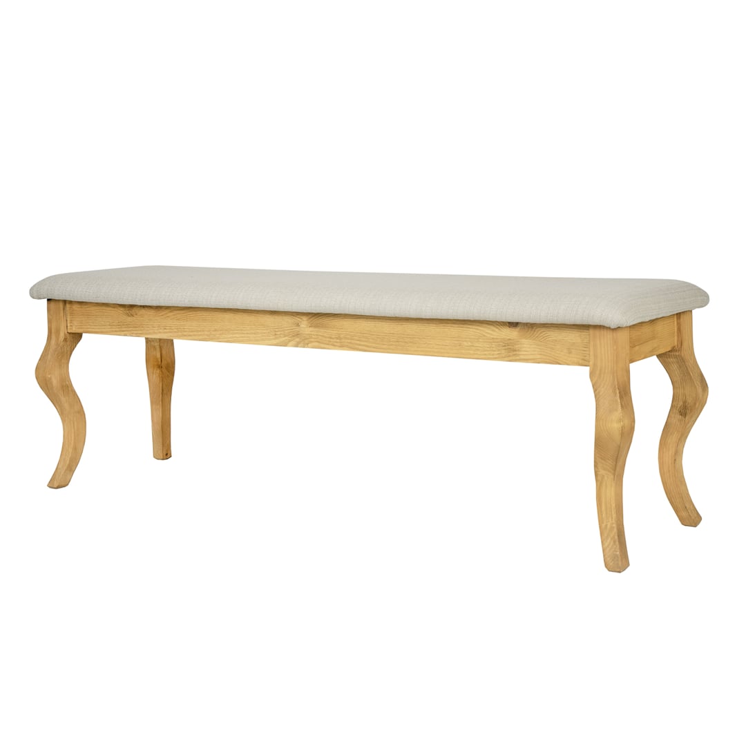 Dřevěná lavice čalouněná je kompletně smontovaná. Klasická lavice má čalouněný sedák v barvě viditelné na fotografiích, umístěný v odpovídající výšce 45 cm a ohnuté nohy, typické pro styl Ludwig.
