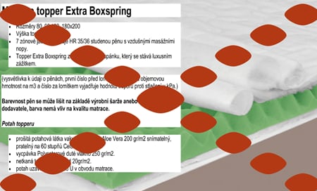 pružinová vložka 8x75x190 cm síla drátu 2,2 mm. Navrchu pružinové vložky je použit polyuretan 25/38 (gramáž/natužení) a po obvodu je použit polyuretan 23/38 (gramáž/natužení). Proti protlačení pružin je použita technická textilie Jatex 900 gr/m2 s vpichovaným polypropylenovým vláknem. Matrace je začalouněna v technické látce a změkčená polyesterovým rounem 80 gr/m2.