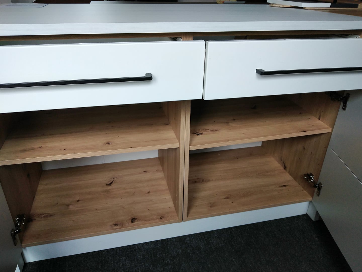 ostrůvek je vyroben z laminované desky - příčka 16 mm, zbytek (vrchní deska, boky) je deska 25 mm, barvy dub artisan, dub sonoma a borovice andersen