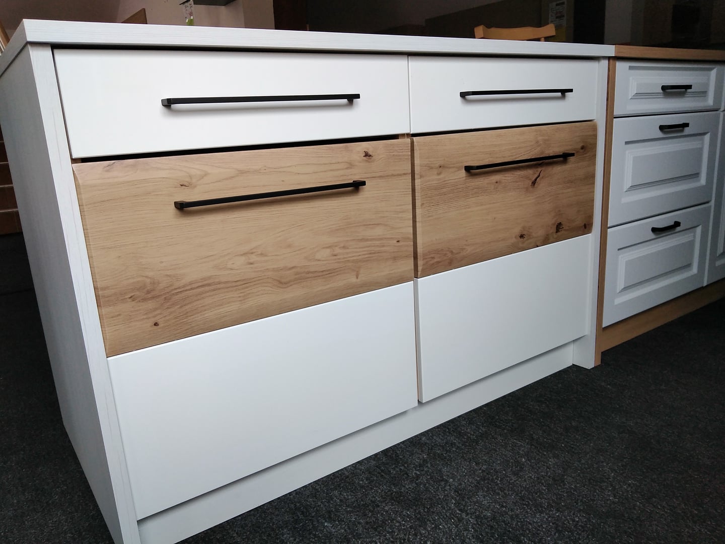 na obrázku je ostrůvek 120 cm vcětně skříněk a soklů ( borovice bílá , artisan bílý lesk ) lze dokoupit jednotlivé díly