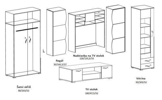 1x nástavec na RTV stolek o rozměrech 120 x 133,5 x 33 cm