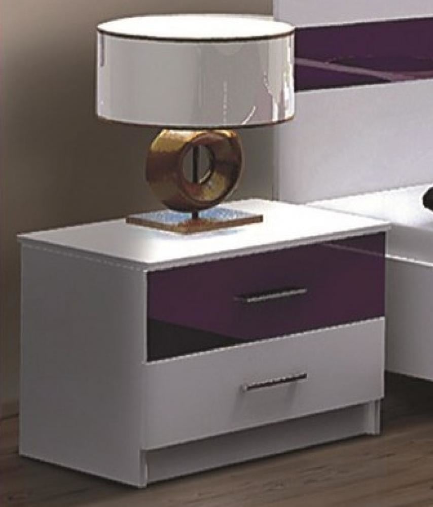 Stolek obsahuje 2 praktické zásuvky. Korpus z kvalitního LTD je v barvě bílé, dveře jsou dekorované fialovou a černou folií
