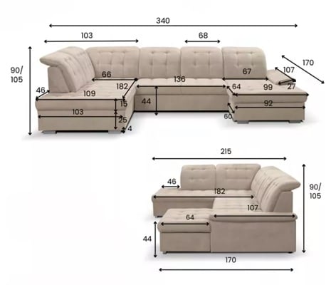 šířka: 340 cm výška: 87 - 105 cm výška sedu: cm hloubka: 220 a 165 cm hloubka sedu: 58 a 71 cm ložná plocha: 140 x 280 cm