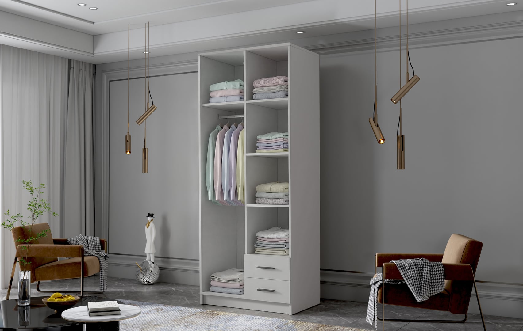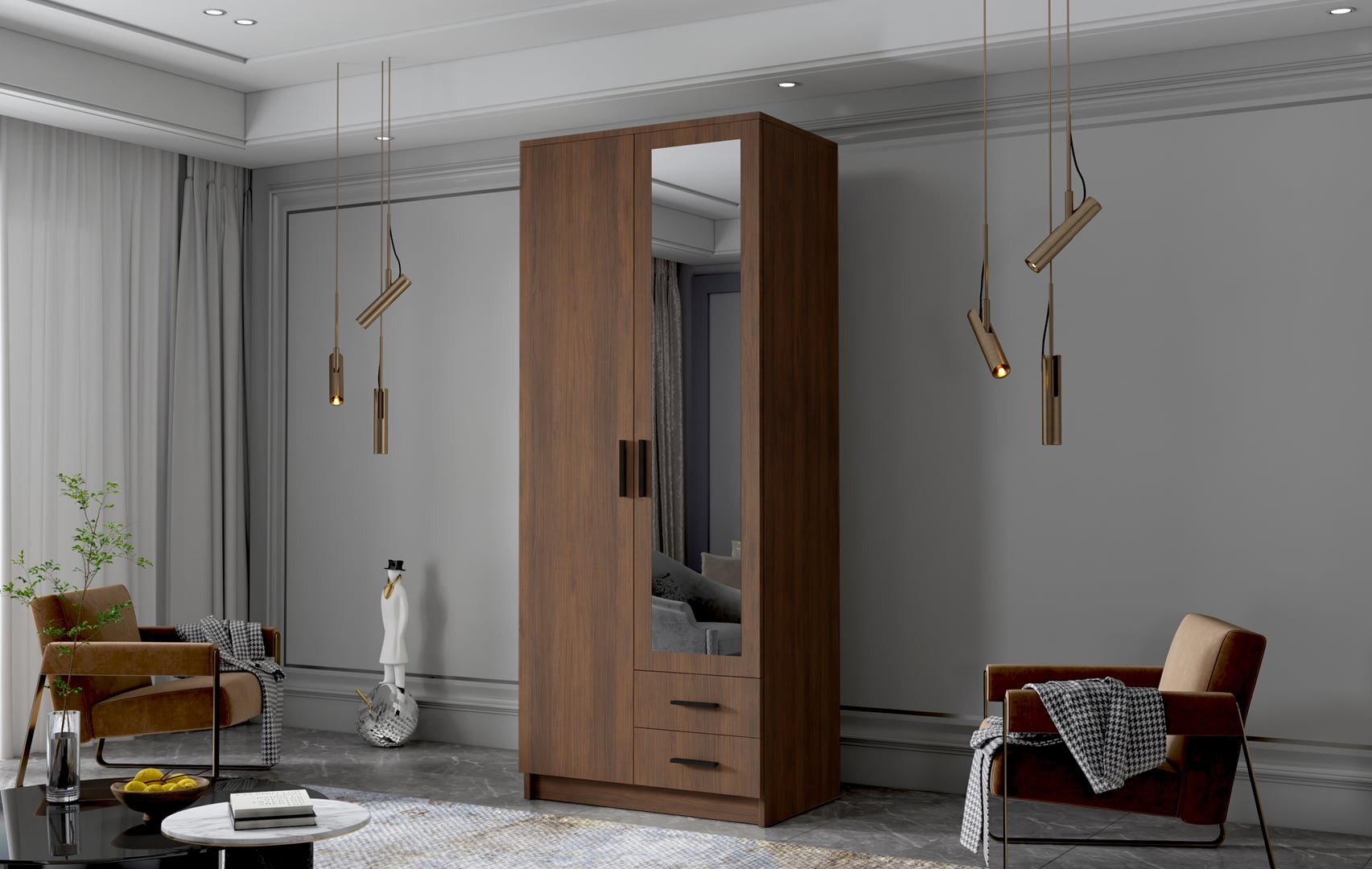 Prostorná šatní skříň Adriana je vyrobena v moderním designu a nabízí velké množství praktického úložného prostoru (viz obrázek).Otvírání dveří klasický způsob. Korpus a dveře jsou vyrobeny z kvalitního lamina (16 mm). Skříň je dodávána v demontu a v různém barevném provedení.