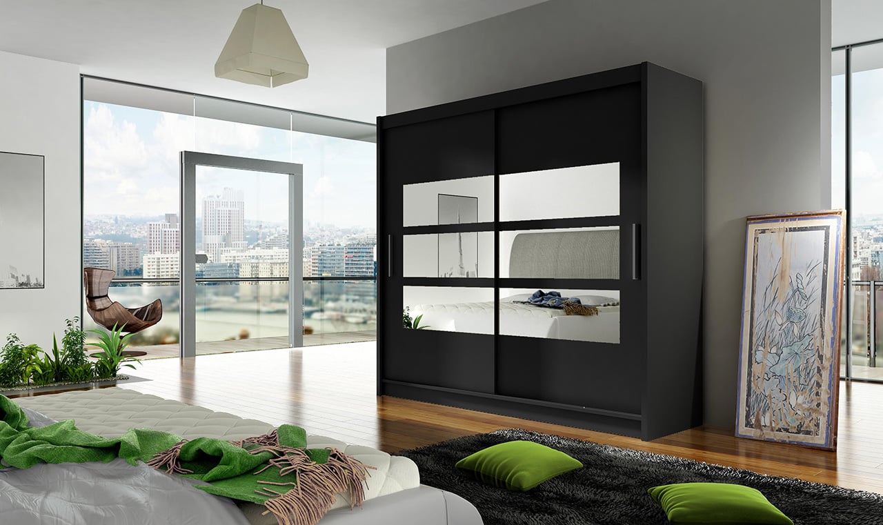 Šatní skříň s posuvnými dveřmi v moderním provedení. Korpus i dvířka jsou z kvalitního lamina ( 16 mm ) v barvědle výběru. Dveře jsou osazeny zrcadlem. Uspořádání polic