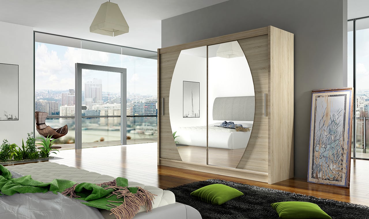 Prostorná šatní skříň je vyrobena v moderním designu a nabízí velké množství praktického úložného prostoru (viz obrázek). Neocenitelný je systém trendových posuvných dveří se zrcadlem, které usnadňují manipulaci a šetří prostor v interiéru. Korpus a dveře jsou vyrobeny z kvalitního lamina (16 mm). Šatní skříní si můžete doplnit stávající vybavení pokoje. Skříň je dodávána v demontu a v barevném provedení sonoma