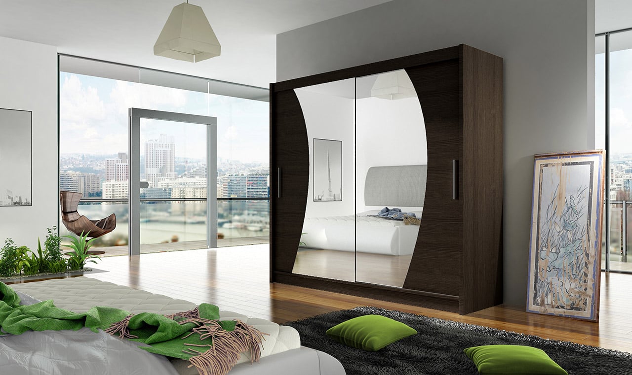 Skříň  s posuvnými dveřmi, je vyrobena z kvalitního lamina o síle 16 mm a hrany jsou ukončeny ABS lištou. Vodící lišty jsou vyrobeny z odolného hliníku a splňují požadavky pro každodenní užívání. Skříň je doplněna zrcadlem, které jí dodává elegantní vzhled a místnost opticky zvětší a prosvětlí. Díky svým rozměrům a uspořádání poskytuje dostatek úložného prostoru. Skříň je dodávána v demontu.