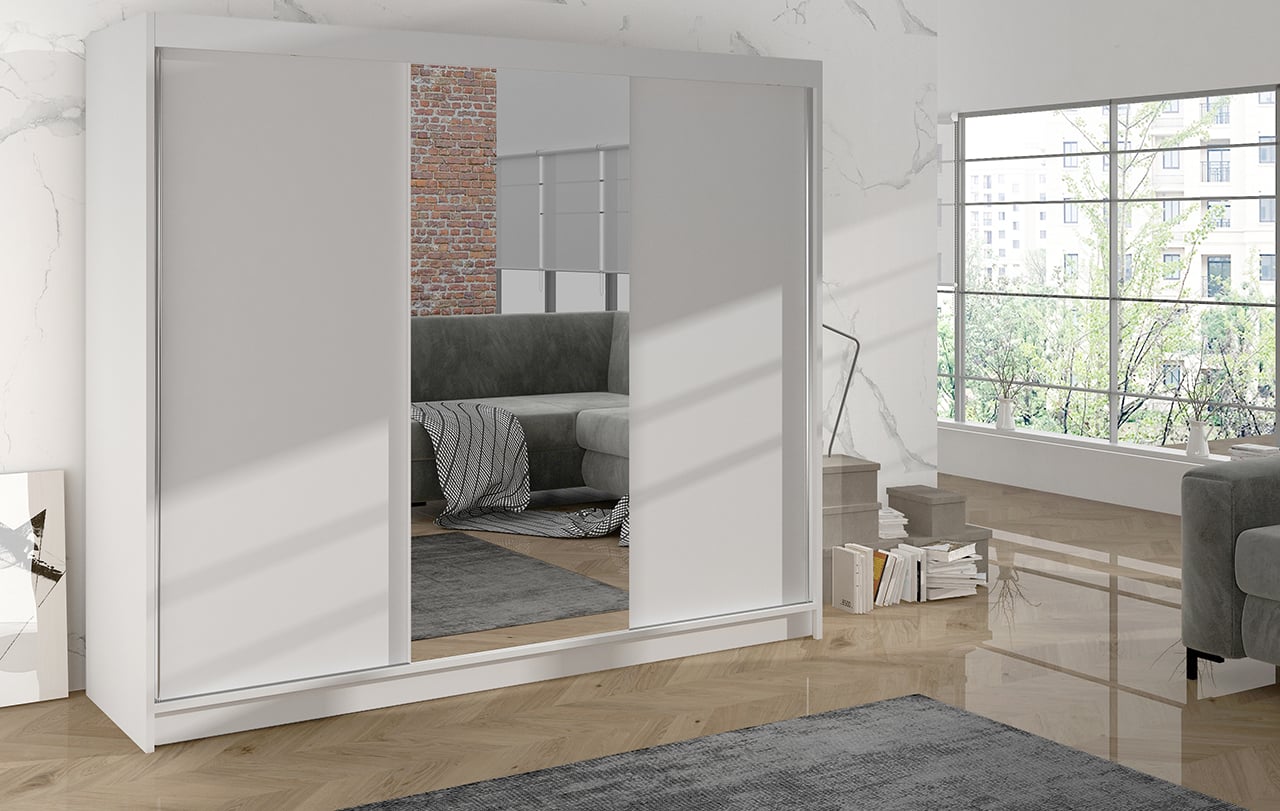 DERI je VELKÁ, praktická třídvéřová skříň s posuvnými dveřmi s velkým zrcadlem