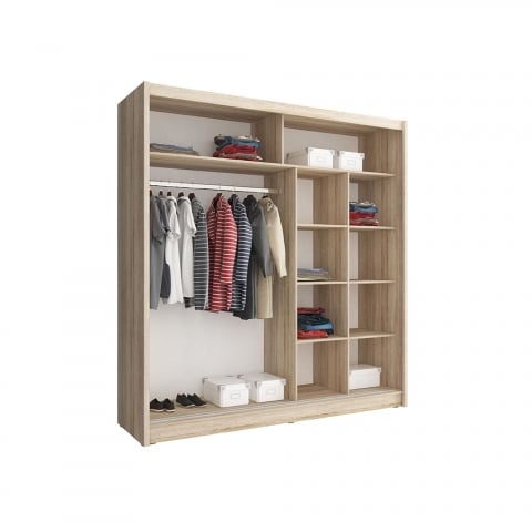 Prostorná skříň v moderním designu má dostatek úložného prostoru. Dále je vybavena dvěmi posuvnými dveřmi a velkým zrcadlem umístěným na vnějším pravém křídle. Boční strany jsou vybaveny dorazovými lištami s ABS systémem proti poškrábání hran.