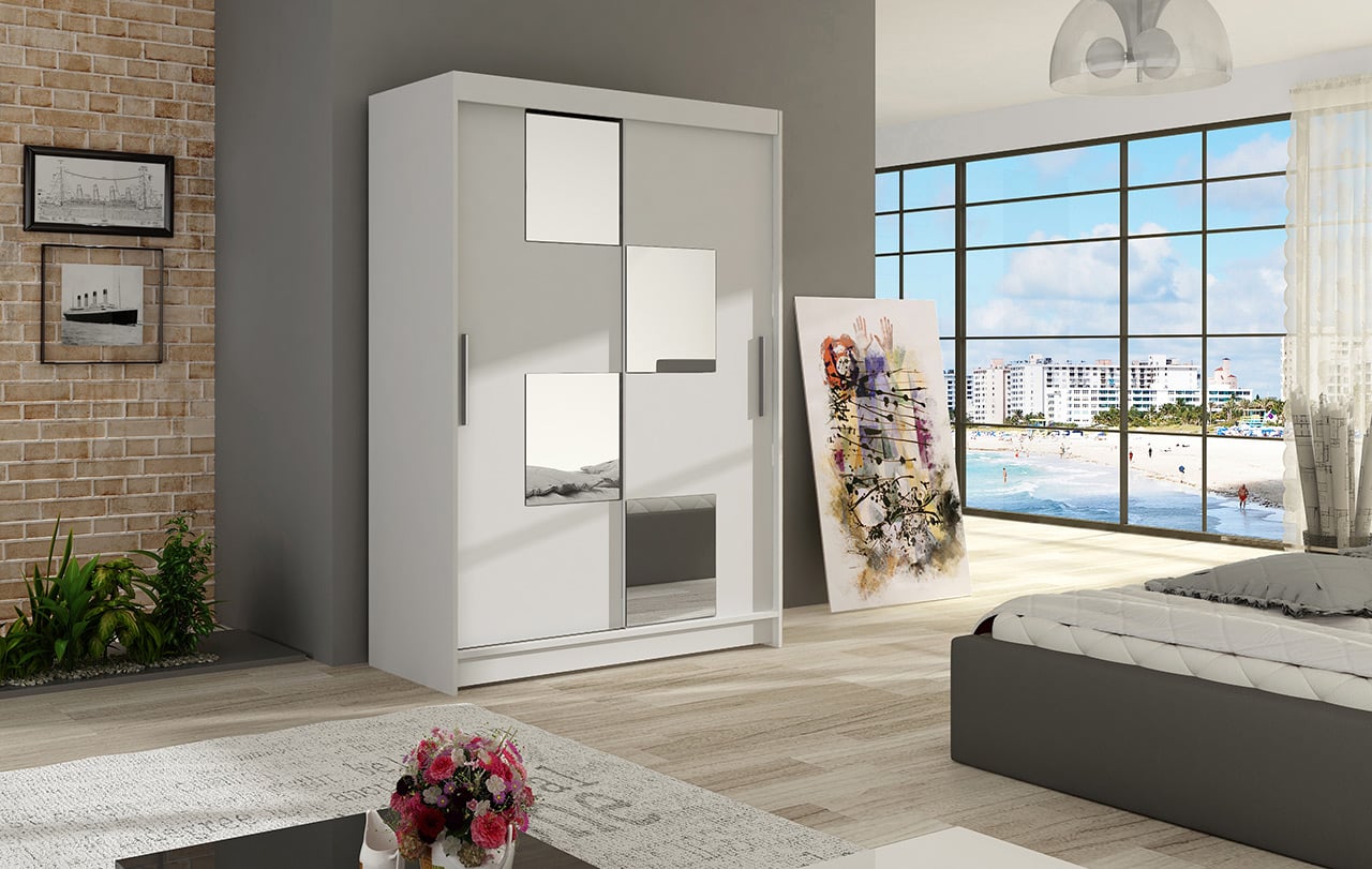 Prostorná šatní skříň NELSON vyniká jednoduchým a elegantním designem. Eleganci podtrhují dlouhé stříbrné úchyty a zrcadla, která jsou nalepena na dveřích skříně. Je vyrobena z lamina o síle 16 mm a hrany jsou ukončeny ABS lištou. Vodící lišty jsou vyrobeny z odolného hliníku. Díky svému uspořádání poskytuje dostatek úložného prostoru. Rozměry ŠxVxH: 120x200x58 cm.