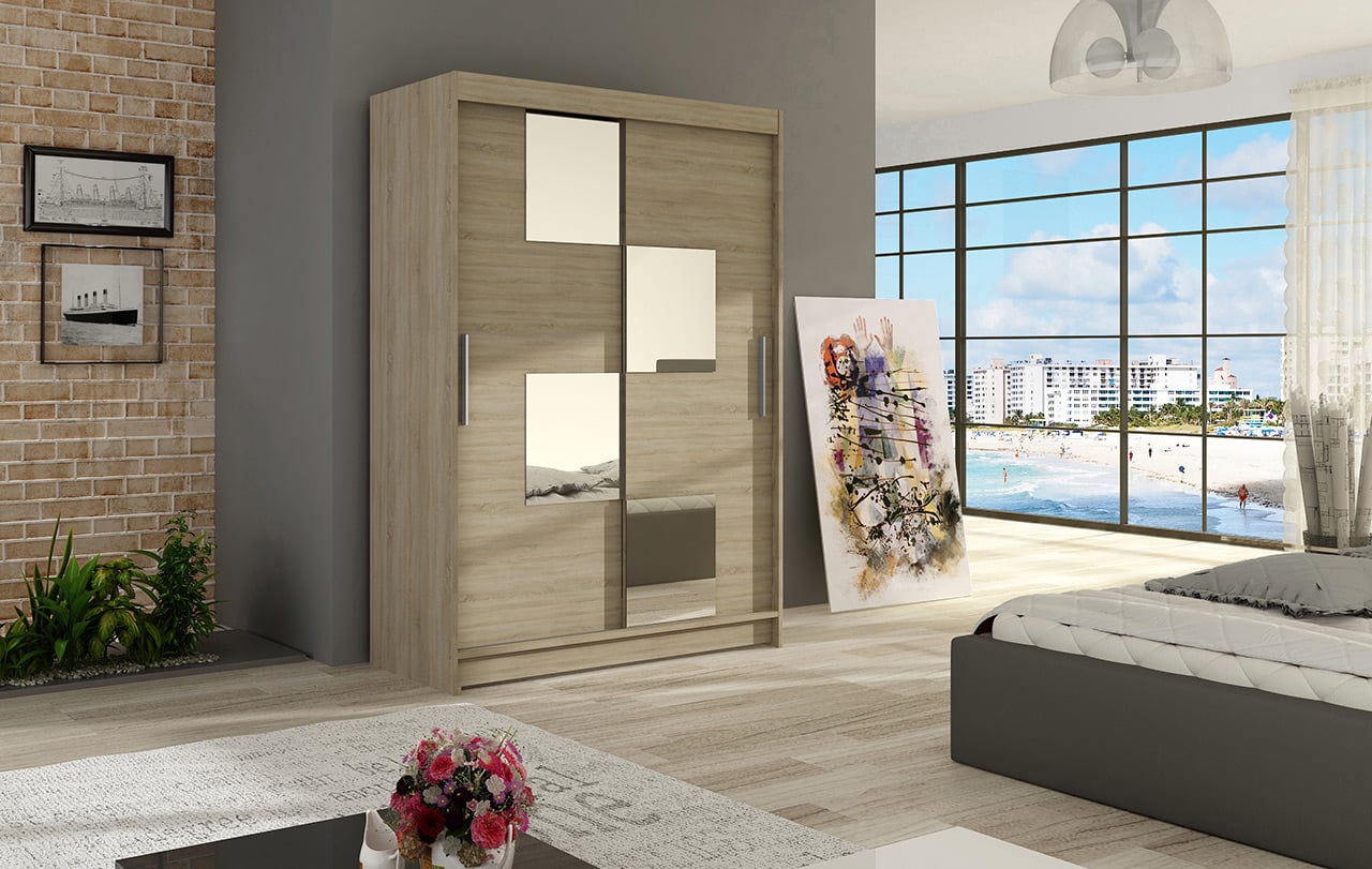 skříň s posuvnými dveřmi je ve velmi elegantním a praktickém provedení. Vnitřní část je rozdělena na dvě poloviny. V jedné části jsou police, v druhé části je věšáková tyč. Skříň má hliníkové ložiskové pojezdy, korpus i dvířka jsou vyrobena z kvalitního lamina ( 16 mm ) . Dodáváme v demontovaném stavu.