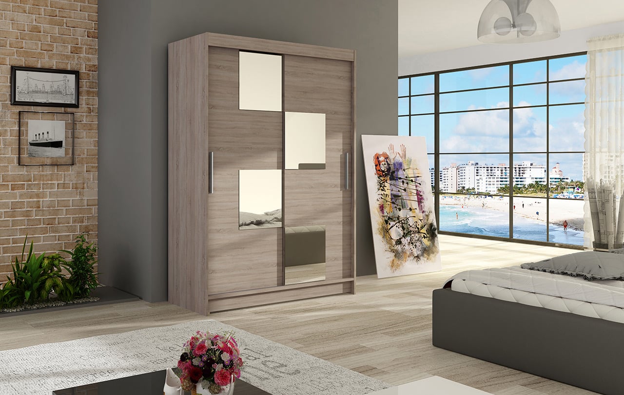Prostorná šatní skříň Miami III vyniká jednoduchým a elegantním designem. Eleganci podtrhují dlouhé stříbrné úchyty a zrcadla, která jsou nalepena na dveřích skříně. Je vyrobena z lamina o síle 16 mm a hrany jsou ukončeny ABS lištou. Vodící lišty jsou vyrobeny z odolného hliníku. Díky svému uspořádání poskytuje dostatek úložného prostoru. Rozměry ŠxVxH: 120x200x58 cm.