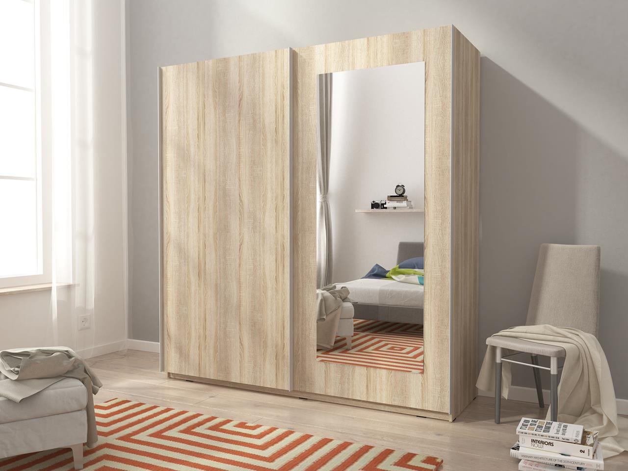 Prostorná šatní skříň v jednoduchém stylu s dvěmi posuvnými dveřmi a zrcadlem umístěným na vnitřním křídle dveří.
