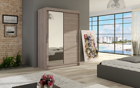 je moderní a a praktická šatní skříň, která má zároveň velmi elegantní design a díky tomu se skvěle hodí do ložnice, předsíně, dětského, nebo studentského pokoje. Eleganci podtrhují dlouhé stříbrné úchyty a moderní nádech dodávají kouřová zrcadla, která jsou nalepena na dveřích skříně. Je vyrobena z lamina o síle 16 mm a hrany jsou ukončeny ABS lištou. Vodící lišty jsou vyrobeny z odolného hliníku a splňují požadavky pro každodenní užívání. Díky svému uspořádání poskytuje dostatek úložného prostoru. Rozměry ŠxVxH: 120x200x58 cm.