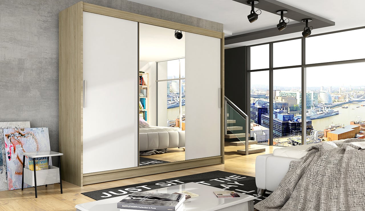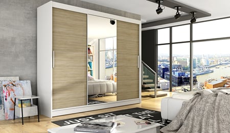 Skříň s posuvnými dveřmi v moderním provedení, která je vyrobena z kvalitního lamina . hrany jsou ukončeny ABS lištou. Na prostředních dveřích skříně jsou nalepená zrcadlaDíky svým rozměrům a uspořádání poskytuje dostatek úložného prostoru. Vodící lišty jsou vyrobeny z odolného hliníku.