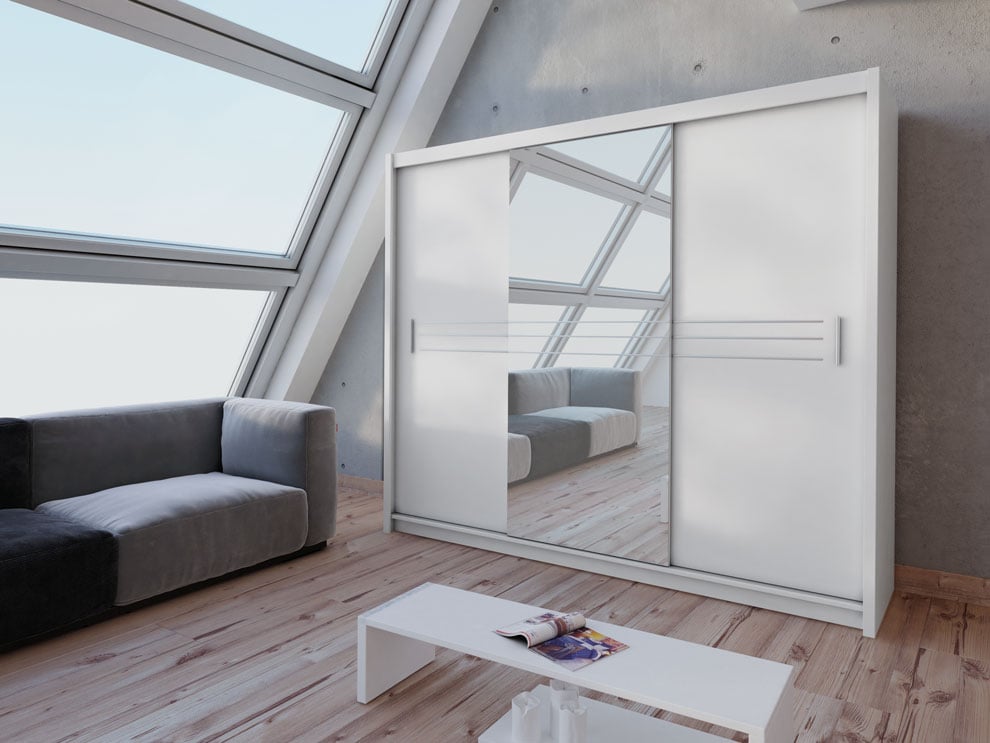 Šatní skříň má troje posuvné dveře, za kterými se nachází police a šatní tyč. Přesné vyobrazení vnitřku skříně můžete vidět na perokresbě. Jedny dveře jsou osazeny zrcadlem, a tak skříň prostor opticky zvětší. Uvnitř skříně jsou dvě praktické zásuvky. Dveře a korpus skříně jsou v černé barvě. Skříň je vyrobena z kvalitního LTD. Hrany skříně jsou ohraničené ABS páskou. Úchytky jsou z plastu. V naší nabídce naleznete skříň i v jiné barvě. Dodáváno v demontu.