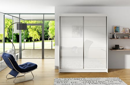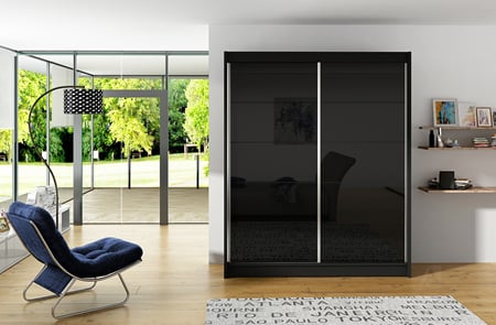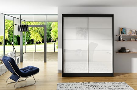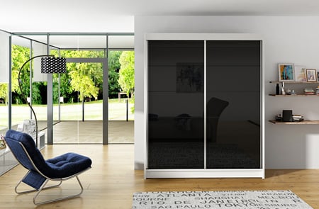 Velmi moderní šatní skříň je speciálně navrhnuta pro lidi, kteří ocení elegantní a praktické provedení. Skříň se otevírá pomocí posuvných dveří, které jsou na hliníkových ložiskových pojezdech Micra Sevroll. Korpus a dveře jsou vyrobené z kvalitního lamina, které je opatřené ABS páskou (16 mm). Skla na dveřích skříně jsou lesklá bílá. Korpus má černou barvu a dveře bílou. Vnitřek skříně je rozdělený na dvě části. V jedné části je police, v druhé části je věšáková tyč. Přesné vyobrazení vnitřku skříně můžete vidět na obrázku. Pokud se Vám nelíbí toto barevné provedení, pak skříň nabízíme i v jiných barvách. Dodáváno v demontu.