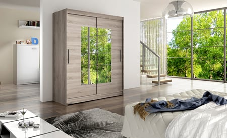 Prostorná šatní skříň je vyrobena v moderním designu a nabízí velké množství praktického úložného prostoru (viz obrázek). Neocenitelný je systém trendových posuvných dveří (hliníkový pojezd), které usnadňují manipulaci a šetří prostor v interiéru. Korpus a dveře jsou vyrobeny z kvalitního lamina (16 mm). Skříň je dodávána v demontu a v různém barevném provedení.