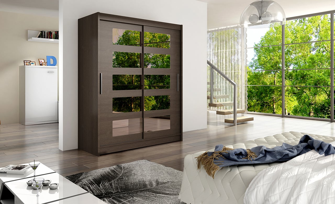 Šatní skříň je navrhnuta speciálně pro lidí, kteří ocení elegantní provedení. Skříň se otvírá pomocí posuvných dveří, na kterých je umístěno pět zrcadel. Vnitřní část skříně je vybavena policemi a věšákovou tyčí. Uspořádání polic viz obrázek. Skříň má hliníkové ložiskové pojezdy. Korpus i dvířka jsou vyrobená z kvalitního lamina opatřeného ABS páskou ( 16 mm ).Dodáváme v demontovaném stavu.Různé barvy