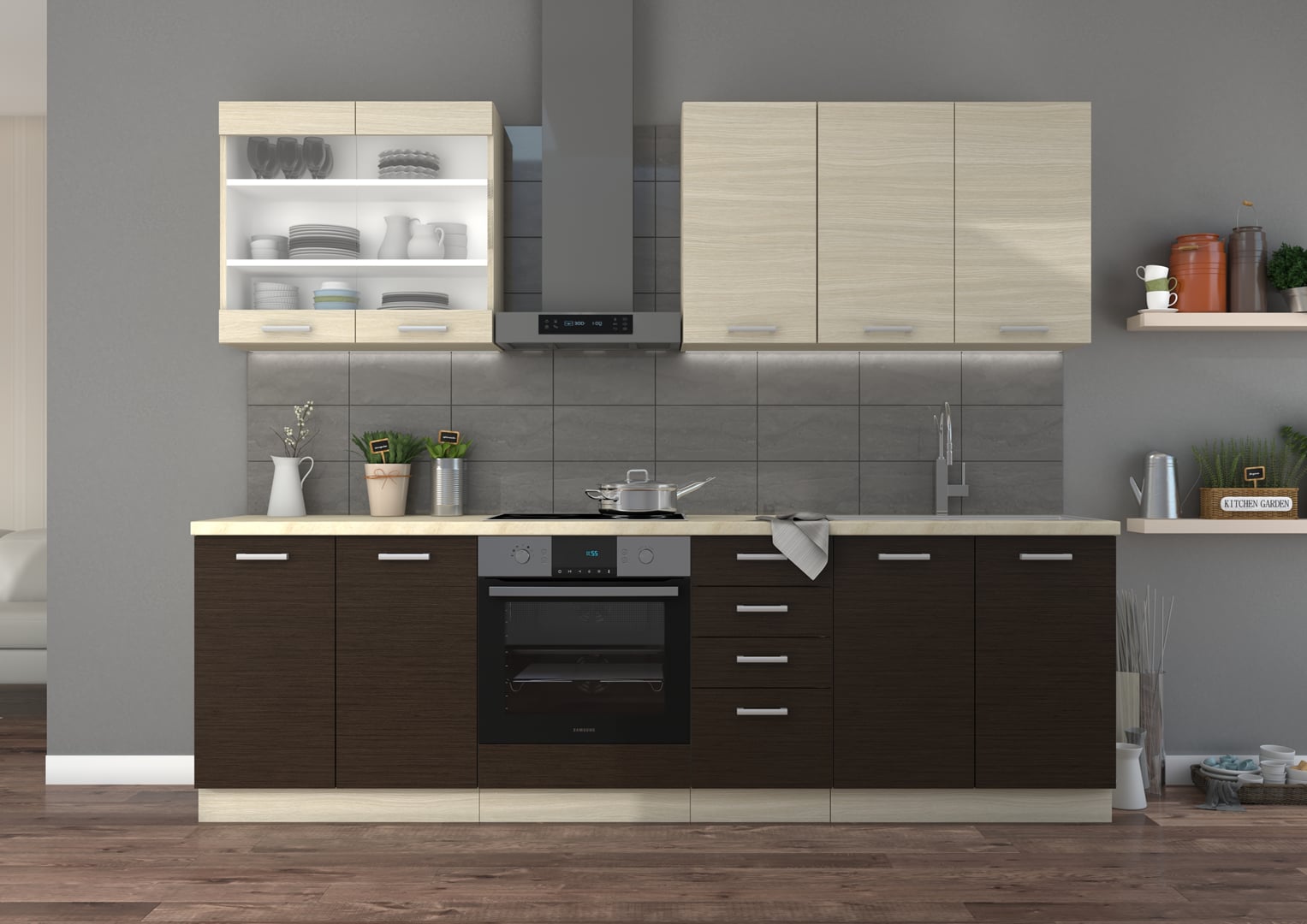Kuchyně je vyrobena z lamina o síle 16 mm. Horní skříňky a korpus jsou v provedení dub ferrara, dolní skříňky legno tmavé.