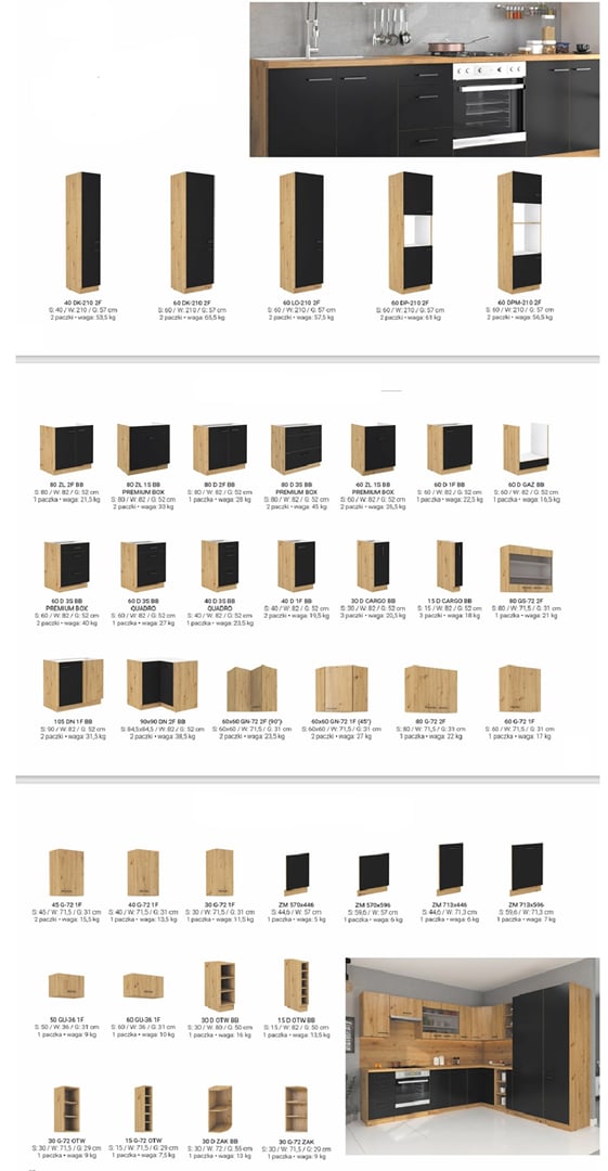 Kuchyně je vyrobena z lamina o síle 16 mm ABS . Horní skříňky a korpus jsou v provedení dub artisan, dolní skříňky černá mat