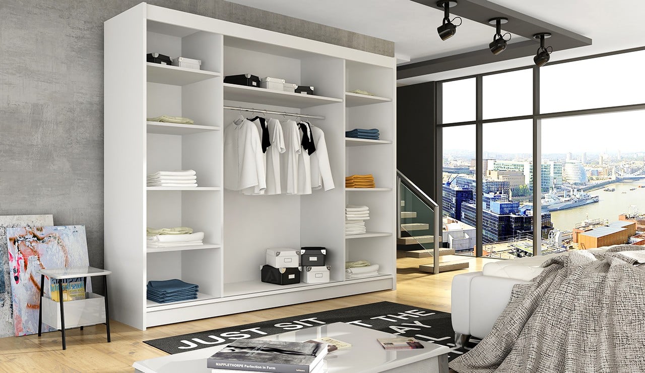 Skříň s posuvnými dveřmi v moderním provedení, která je vyrobena z kvalitního lamina . hrany jsou ukončeny ABS lištou. Na prostředních dveřích skříně jsou nalepená zrcadlaDíky svým rozměrům a uspořádání poskytuje dostatek úložného prostoru. Vodící lišty jsou vyrobeny z odolného hliníku.