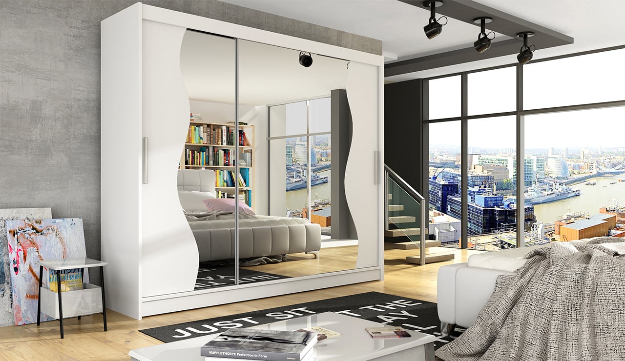 Skříň s posuvnými dveřmi v moderním provedení, která je vyrobena z kvalitního lamina . hrany jsou ukončeny ABS lištou. Na prostředních dveřích skříně jsou nalepená zrcadlaDíky svým rozměrům a uspořádání poskytuje dostatek úložného prostoru. Vodící lišty jsou vyrobeny z odolného hliníku.