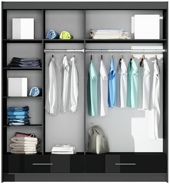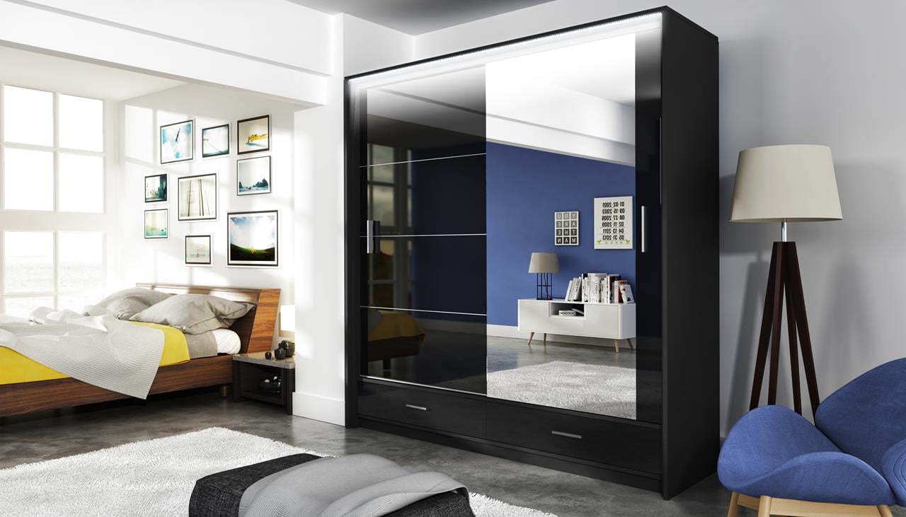 Šatní skříň SAM 203 v jednoduchém a elegantním stylu, má posuvné dveře, které ušetří prostor a vnitřní uspořádání v jedné polovině policové a v druhé má v horní části polici a pod ní šatní tyč.