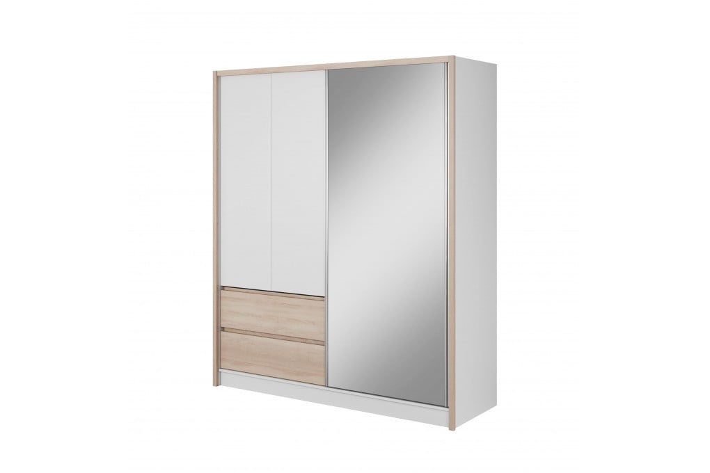 Moderní šatní SAPA 154 s posuvnými dveřmi, zrcadlem a zásuvkami . Lze ji použít samostatně nebo k jakémukoliv nábytku ve stejném dekoru. Konstrukce je vyrobena z kvalitního a odolného lamina v bílé barvě v kombinaci s dekorem dřeva. Úchytky jsou hliníkové ve stříbrné barvě.