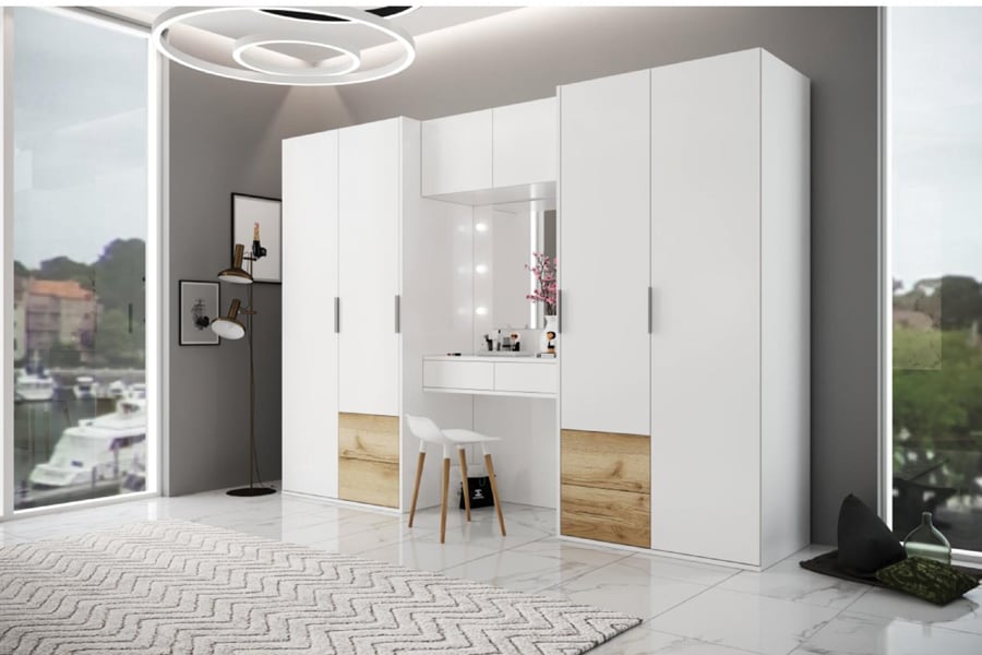 Šatní skříň s dveřmi, šuplíky i s toaletkou v moderním provedení. Korpus i dvířka jsou z kvalitního LTD a barevné provedení je bílá/dub grandson natural/ zrcadlo. Skříň obsahuje praktické zrcadlo. . Hrany u skříně jsou ohraničeny ABS páskou. Dodáváme v demontovaném stavu. ROZMĚRY : Š/V/HL : 300/217/61